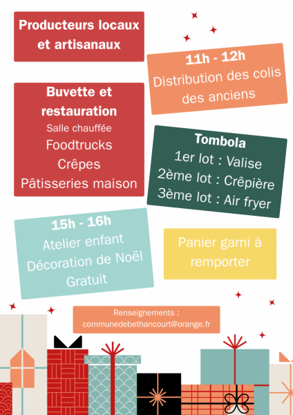 Au programme : producteurs locaux et artisanaux, food-trucks et salle chauffée, atelier enfant (15h-16h), distribution des colis des anciens (11h-12h), tombola et panier garni à remporter.
