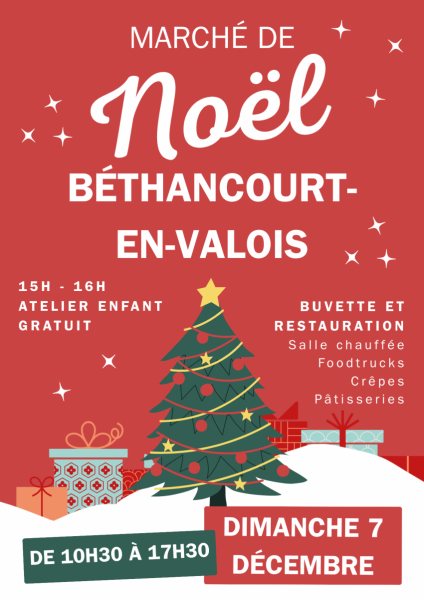 Le marché de Noël, organisé par le comité des fêtes de Béthancourt-en-Valois, aura lieu le dimanche 7 décembre, de 10h30 à 17h30.